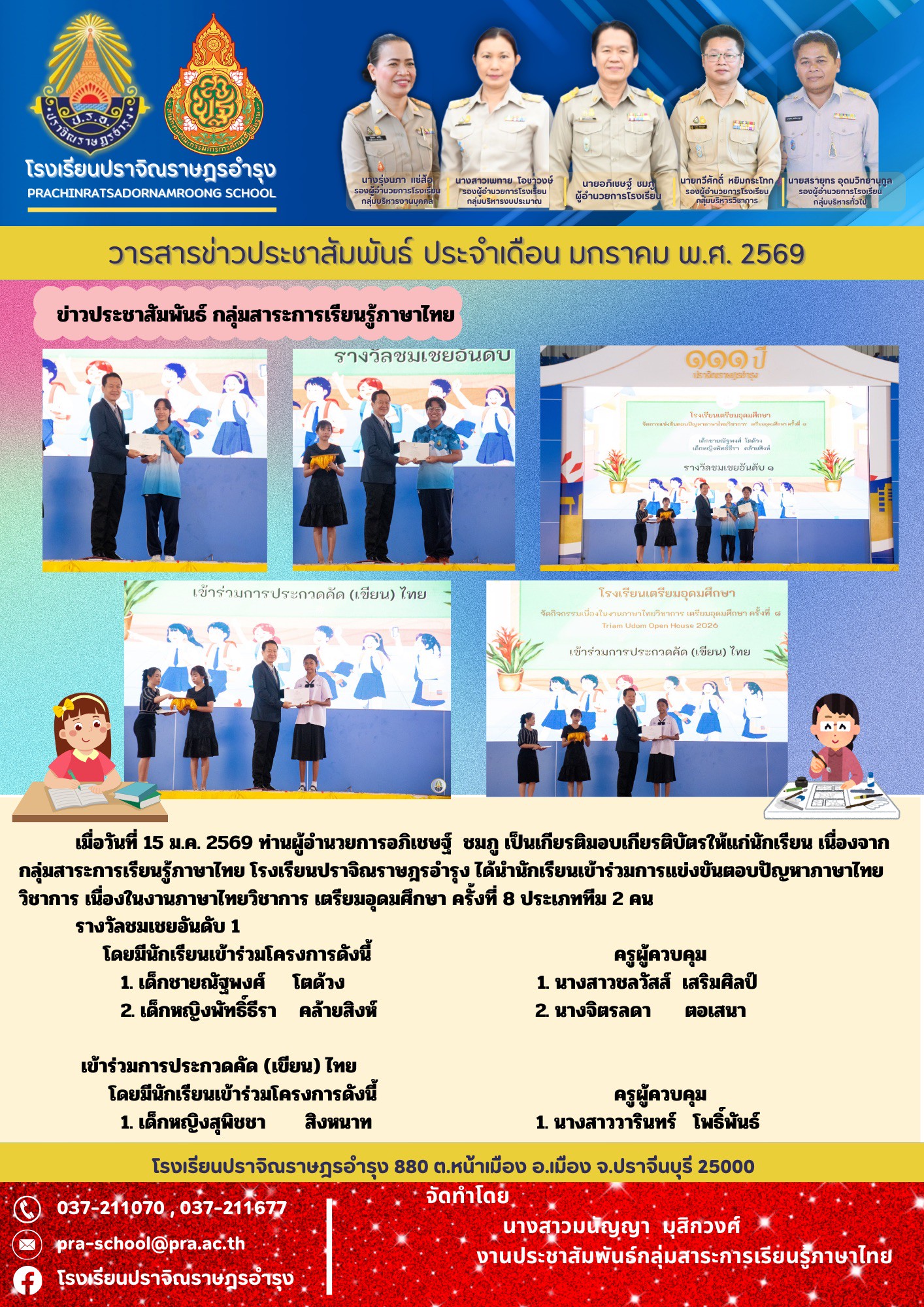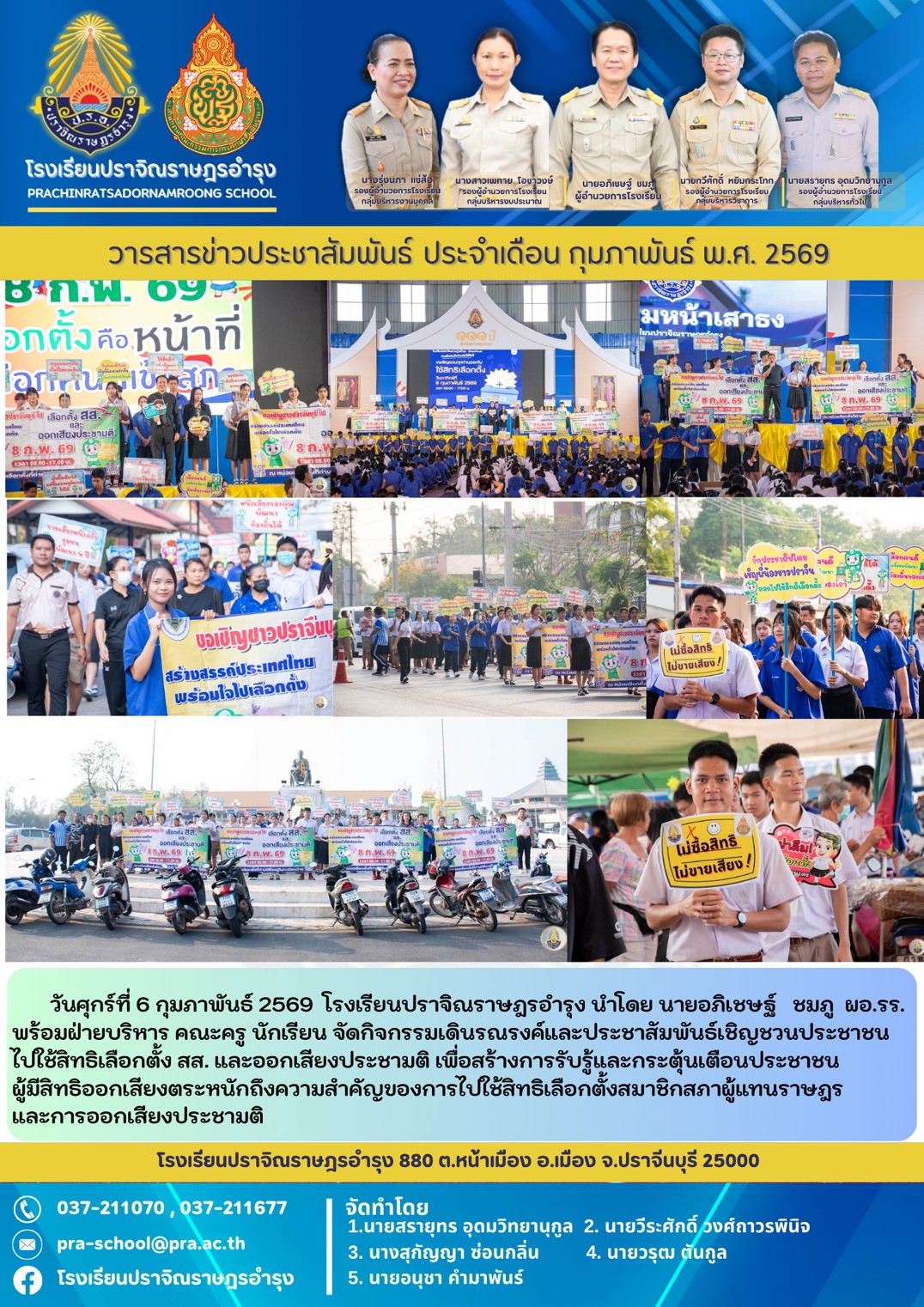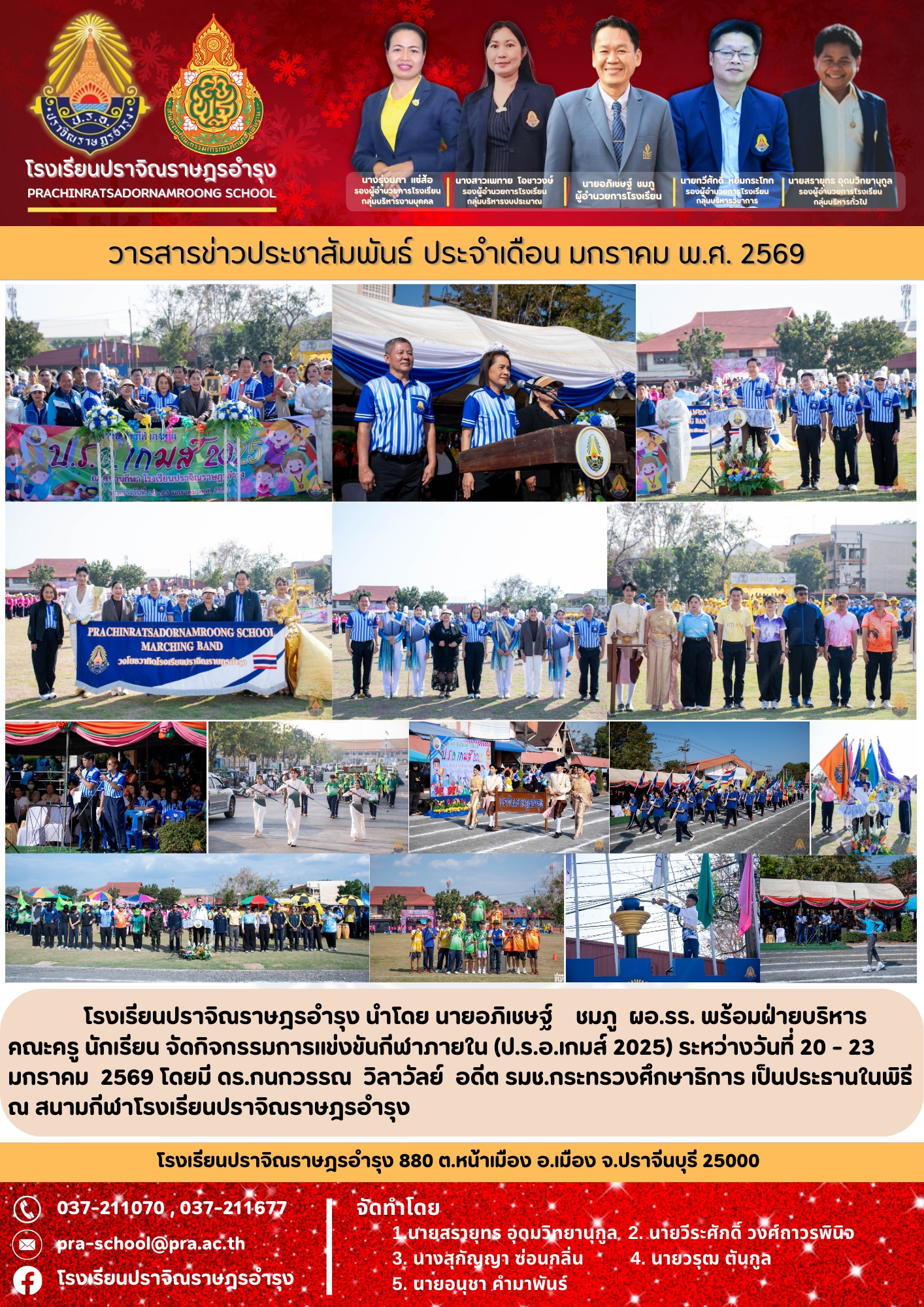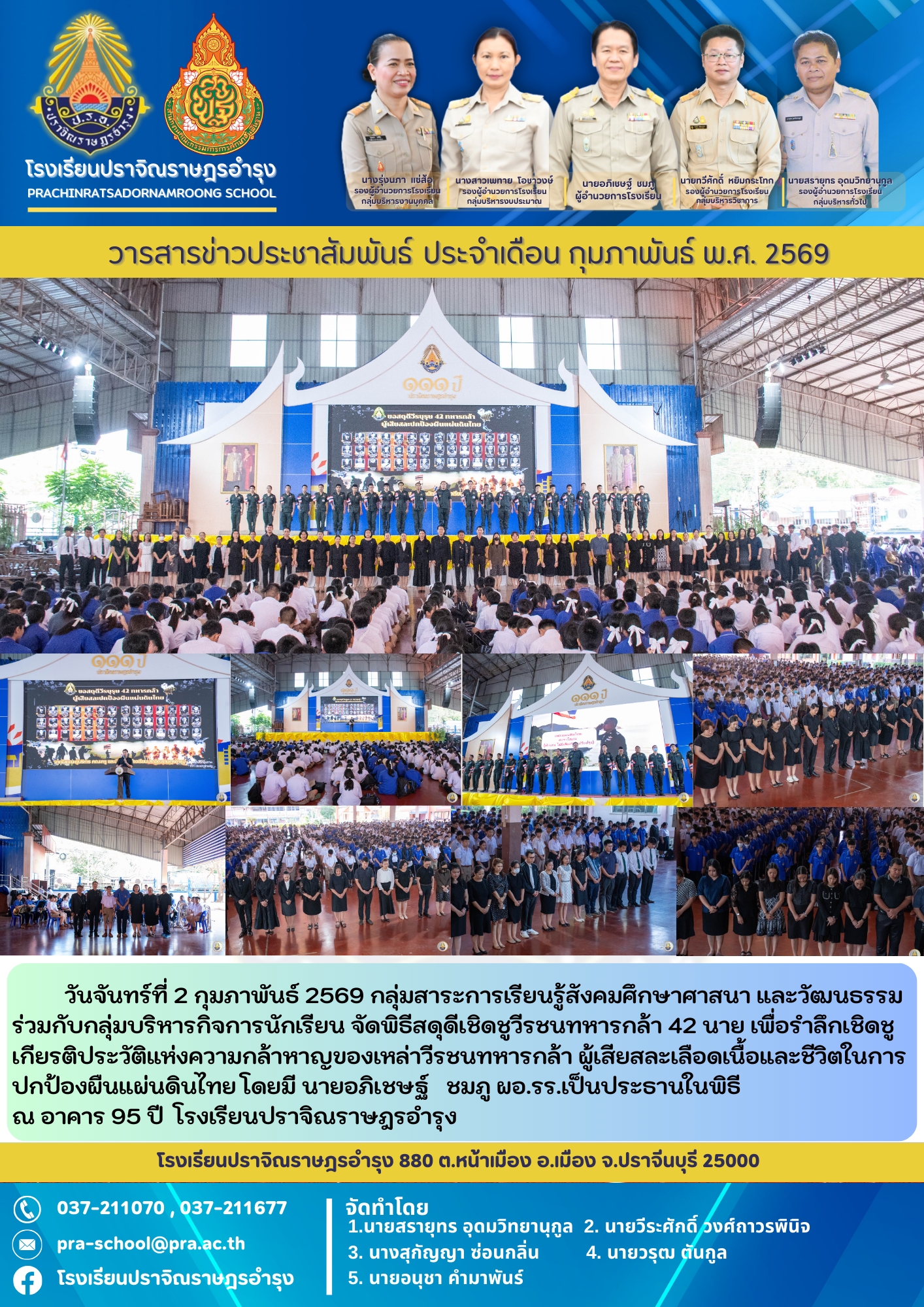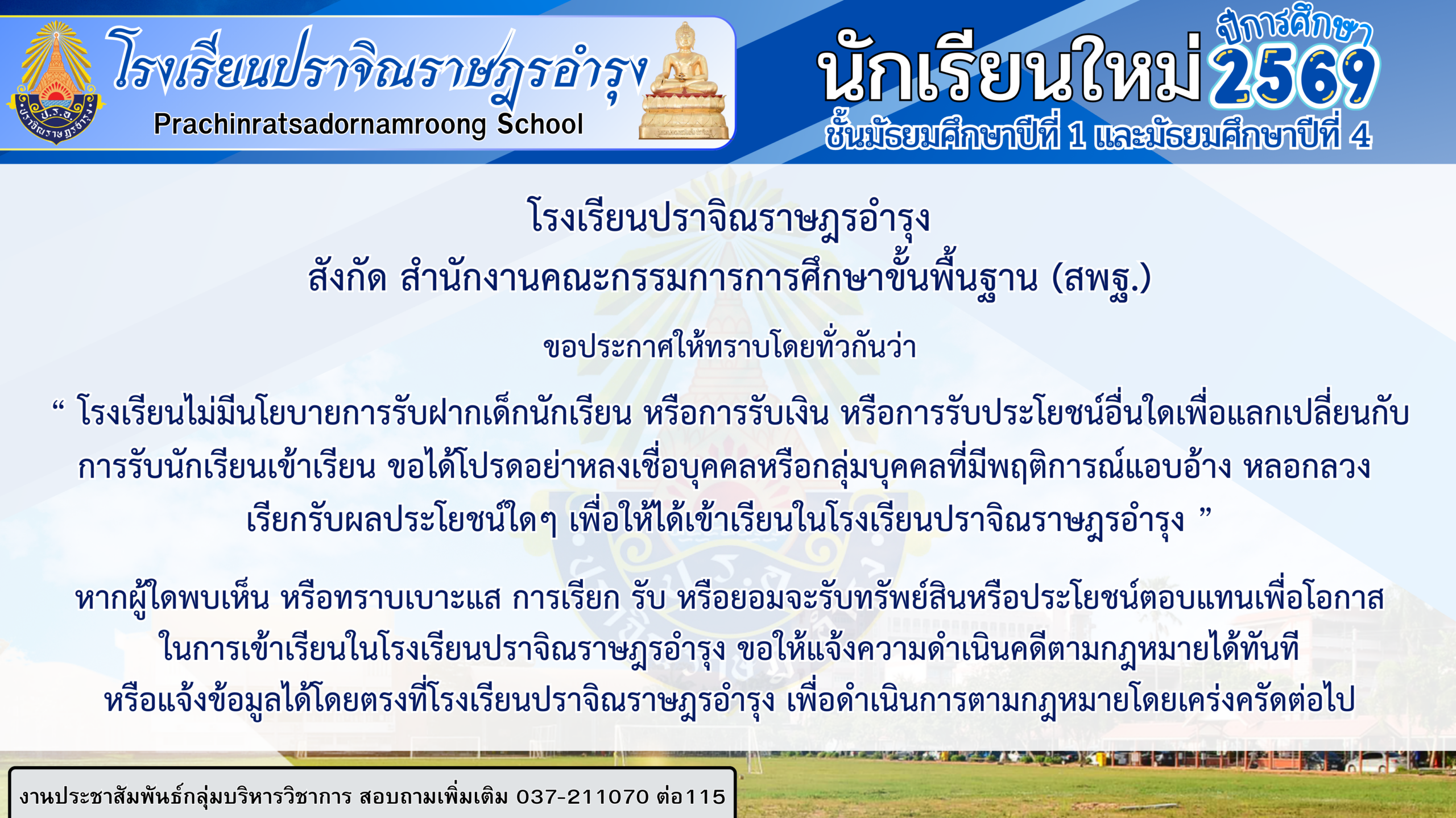 โรงเรียนปราจิณราษฎรอำรุง เลขที่ 880 ถนนปราจีนอนุสรณ์ ตำบลหน้าเมือง อำเภอเมือง จังหวัดปราจีนบุรี 25000 โทรศัพท์ : 037-211070 อีเมลล์ : saraban@pra.ac.th